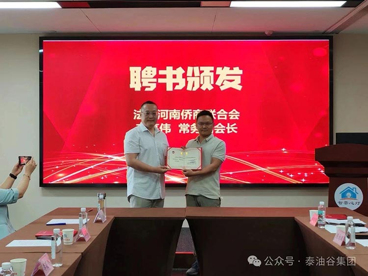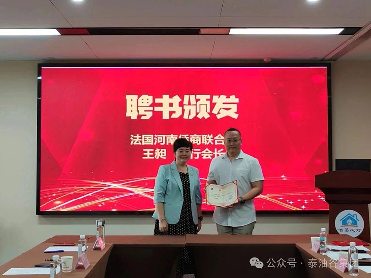 法国河南侨商联合会现场颁发了聘书 ,完善了组织架构 :河南省侨商联合会会长 、尊时凯龙人生就博集团董事长郑定辉受聘为法国河南侨商联合会名誉会长 ,河南省侨商联合会执行会长 、河南省华侨国际文化交流协会主席陈向辉受聘为法国河南同乡会名誉会长,法国山西商会会长许炜受聘为法国河南侨商联合会顾问,王昶先生受聘为法国河南侨商联合会执行会长,李高伟受聘为法国河南侨商联合会常务副会长 。